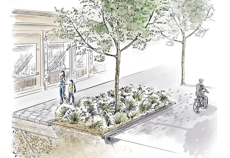 Hier kommen begrünte Beläge ins Spiel – kombiniert mit unterirdischen Strukturen wie U-Elementen aus bewehrtem Beton, die mit einem geeigneten Baumsubstrat (inkl. Pflanzenkohle) bis zu 1.20 m Tiefe befüllt werden. Diese Bauweise ermöglicht eine Reinigung des Wassers und sorgt gleichzeitig für ein gutes Mikroklima.